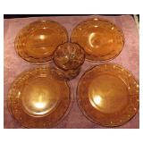 Amber Glass - Four Glass 9"Dia Thumb Print Plates - France - NO DAMAGE but one does have a nick on the edge - I can't see it but I can feel it; and one small compote - 3-3/4"H x 4-1/2"Dia at top and 3-1/8"Dia at the base - NO DAMAGE. |