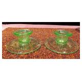 Green Vaseline Glass Candle Stick Holders - 1-1/2"H x 3-3/4"Dia at base. No Damage - In perfect shape. |