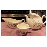 Universal Potteries Inc - Cambridge Ohio USA - Fascination - Shasta Daisy Design - gravy boat dish - 4"H x 9"L including spout and handle x 3-3/8"W - NO chips, nicks, cracks or crazing; Tea Pot with Lid - 6"H x 9"L including spout and handle x 5-1/4"W - Lid does have a chip on it - see photo - NO Damage on the Spout - Tea pot itself - NO Damage - no chips, nicks or cracks or crazing on this just a chip on the lid; Cup - 3"H x 4-3/4"L including the handle x 3-1/2Dia - does have three rough spots that looks like nicks. |
