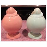 TS&T LuRay salt and pepper shaker set - pink and blue. 3-3/4"H x 2-1/2"Dia in the middle - base is 2-3/8"Dia. Looks to have one of the shaker's holes has roughness on each in the same location - could be a manufacture Flaw or could be a nick - rest has NO DAMAGE. |