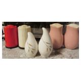 Three Sets of Salt and Pepper Shakers - One from Universal Potteries - 3-3/4"H and 3-1/4"H; Bonny Ware made in USA - Off White and Red - 3-3/4"H x 2-1/4"Dia at the bottom; Pink Salt and Peppers - does show Crazing - 4-1/8"H x 2-1/2"Dia. |