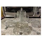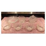 Clear Glass - Four matching Waffle design Cups - 2-1/4"H x 4-3/4"L including the handle x 3-3/4"Dia - NO chips, nicks, or cracks; Weave style clear glass bowl - 1-5/8"H x 7-1/2"Dia - No chips, nicks or cracks - does have a roughness where the seam is - looks like it is a manufacturer flaw; Creamer and Covered Sugar bowl - both matching - Creamer - 3-1/2"H x 4-3/4"L including the handle and spout - NO Chips, nicks or cracks; Sugar Bowl with lid - 4-1/2"H including the lid x 5-3/4"L including both handles x 3-1/2"Dia - one small nick on the inside rim of the sugar bowl - that is all - rest in very good condition. |
