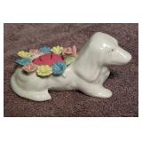 Small Dot Pin Cushion - Feels like Bone China - Flowers look to be in Perfect shape. White dog with pink, blue, yellow flowers and two three leafs. No Chips, nicks or cracks or crazing - does have several pin holes on it that are glazed over. 2-1/4"H x 4"L x 2"W. |