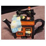 Sewing Tea Pot - Produced for Houston Harvest Gift Products LLC - 5"H x 6-3/4"L from spout to handle x 3-1/4"W - Only Damage is one small chip on the Spool of thread at the top - does have a little crazing going on too. |