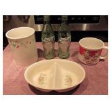 Divided Bowl - Microwave and oven proof - made in Japan - Floral design - No Chips, nicks or cracks - Does have Crazing - 2-1/2"H x 8-1/8"L x 6"W; Two Coca-Cola Classic Bottles - 7-1/2"H - No chips, nicks, cracks or crazing; Campbell Soup Cup - Campbell's kids on both sides - 1991 - 3-1/2"H x 5"L including the handle x 4"Dia - No chips, nicks or crazing - does have a crack; Summer Fruit Canister - great to re-purpose or use as a vase or kitchen tools or silverware - No chips, nicks, cracks or crazing - 5-1/2"H x 4-3/8"Dia. |