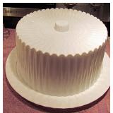White Decorative Plastic Cake Dish and Cover - In very good condition - No Damage that I could find - Dish - 13-1/8"Dia - Cover is 6"H including the handle on top x 10-1/4"Dia. |