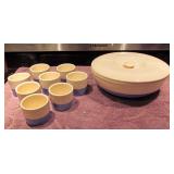 Universal Potteries - Vintage - Eight Custard Desert Bowls - 2-1/2"H x 2-5/8"Dia - Based on the fact of their age - NO Chips or nicks on the top rim - bottom does show some nicks - see photo - and they do have crazing on them because of age; Also you get the large matching serving bowl with lid - 4"H x 9-3/8"Dia (Lid) - Bowl rim is just under the 9-3/8"Dia by a hair - Bowl - NO Chips on the upper rim of the bowl - does have a nick on the bottom rim and the lid does have an age nick underneath rim edge. |