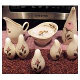 Five Salt and Pepper Shakers - (2) 4"H and (3) 3-1/4"H - No chips, nicks or cracks - one of the three does have crazing on it; Creamer - Does have a crack down one side - no other damage and no crazing - 5"H; Sugar Bowl does have one manufacture flaw on the rim - 3-1/4"H x 5-1/4"L x 4-1/2"W; and the lid (which is a small butter dish(?) - the color is off on the flower - 4"Dia; and one Oil container with screw on lid on the side - 7"H - and does have a very small crack in the corner - no crazing - see photo - Universal Potteries Inc - Alpine - Fascination. |