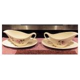 Two Gravy Boats - one gravy boat is 4"H x 8-3/4"L including the handle x 3-5/8"W - does have a manufacture flaw on the edge close to the spout - no chips, nicks or cracks or crazing; and the other has NO DAMAGE; and Two underneath plates - 10"L x 5-3/8"W x 1"H - both NO DAMAGE - one does have crazing only - for the gravy boats - Universal Potteries Inc - Alpine - Fascination. |