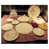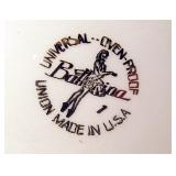 Universal Oven-Proof - Union Made in USA - Ballerina Design - two creamers - 3-1/4"H x 5-1/2"L x 4"W - NO chips, nicks, cracks or crazing - one does have some manufacture flaws and both does have what looks like stains - may just need a good washing; One serving platter - 22-5/8"L counting the handles x 10-3/4"Dia - NO chips, nicks, cracks or crazing. Three Dinner Plates - 9-1/4"Dia - NO chips, nicks, cracks or crazing. NOTE: Adding Five additional Dinner Plates in the same condition as the others. |