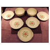 Five Pink Rose Bowls with handles - 1-1/2"H x 6-7/8"L including the handles x 6-1/2"Dia and two tall bowls with pink roses - 3"H x 5-1/4"Dia - one of the tall bowls does not have ANY DAMAGE on it. The rest either has a chip, nick, stain or crazing on them |
