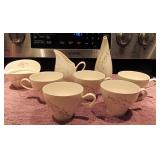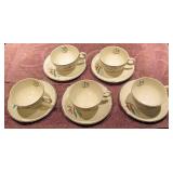 Five matching Cups and Saucers - Universal Oven-Proof - Union Made in USA - Ballerina - Not marked - same design - Cup: 2-1/8"H x 5"L including the handle x 4"Dia - NO Chips, nicks, cracks or crazing on these. Saucers: 6-3/8"Dia. - NO Chips, nicks, cracks or crazing on these. NOTE: Picture shows 5 cups and saucers - found two more sets in the same condition as listed. For a total of Seven Matching Cups and Saucers. |