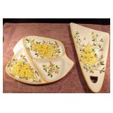 Made In Italy - two matching Snack Trays - The Three sided one has yellows and browns - 2"H x 15" on one side x 12" on one side x 8-1/2" on the last side. The other is a three divided plate - Same design - does have a chip - whither it happened at the time of making it or not - the color match is perfect - I had to do a double take to notice it. NO Other Chips, nicks, cracks or crazing. |