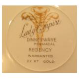 Six 7-3/8"Dia Plates - Oven Proof - Lady Empire - Dinnerware - Permacal - Regency - Warranted 22KT Gold - Saw Two Manufacture Flaws that looked like a chip but was not - all but one has crazing on it. |