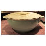 Very large Raymor Universal Ovenproof Cambridge USA - Dish with cover lid over the sauce or dressing or cheese or whatever - 3-1/2"H not counting the lid top x 16-1/4"L (from handle to handle) x 9-1/4"W. Bowl is in perfect shape. The lid does have a chip on the top nob. The lid fit so that was why I included it. Very nice serving bowl. |