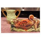 Wall Pocket - can be hung on the wall - Duck pottery - un-marked - 4"H x 6-1/2"L x 2-1/2"W - Four Age Cracks - crazing also; Green Vase with Gold Trim Handles and base - 4-1/2"H x 5-3/4"L including both handles x 3-1/2"W - I see two Chips - one Manufacture Flaw at the base - does have crazing. |