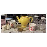 Two Water Classes with lids - could be used as vases too - 6-1/2"H x 2-1/2"Dia.; Amber Cup with metal handle - No Damage - 3-1/4"H x 4-1/4"L including handle x 3"Dia; USA Christmas Cup - 3-1/4"H x 4-3/4"L including in the handle x 3-3/8"Dia - NO DAMAGE; Norman Rockwell - The Toymaker Mug - 4"H x 4"L including the handle x 2-3/4"Dia - Like NEW; Small syrup or creamers - 2-1/4"H - does have crazing; Yellow Tea Pot - Missing Lid - only damage is on the spout - does have crazing - 6-1/4"H x 9-1/4"L including spout and handles x 5-1/2"W. |