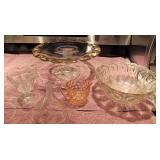 Kitchen Items: Pink Fostoria Creamer - 2-3/4"H x 4-1/4"L from spout to Handle x 3"W - NO DAMAGE; Glass Funnel - 5"H x 4"Dia - Looks like there are some nicks on the end of the funnel; Ice-cream glass stem - 4"H x 3-3/4"Dia - Small chip on the underneath upper rim; Glass Cake Pedestal Stand - 4-3/4"H x 10-3/4"Dia - NO DAMAGE - Just Gold Trim Wear; Large Glass Serving Bowl - 3-1/4"H x 8-1/4"Dia - Crack down toward the base - great piece for re-purposing. |